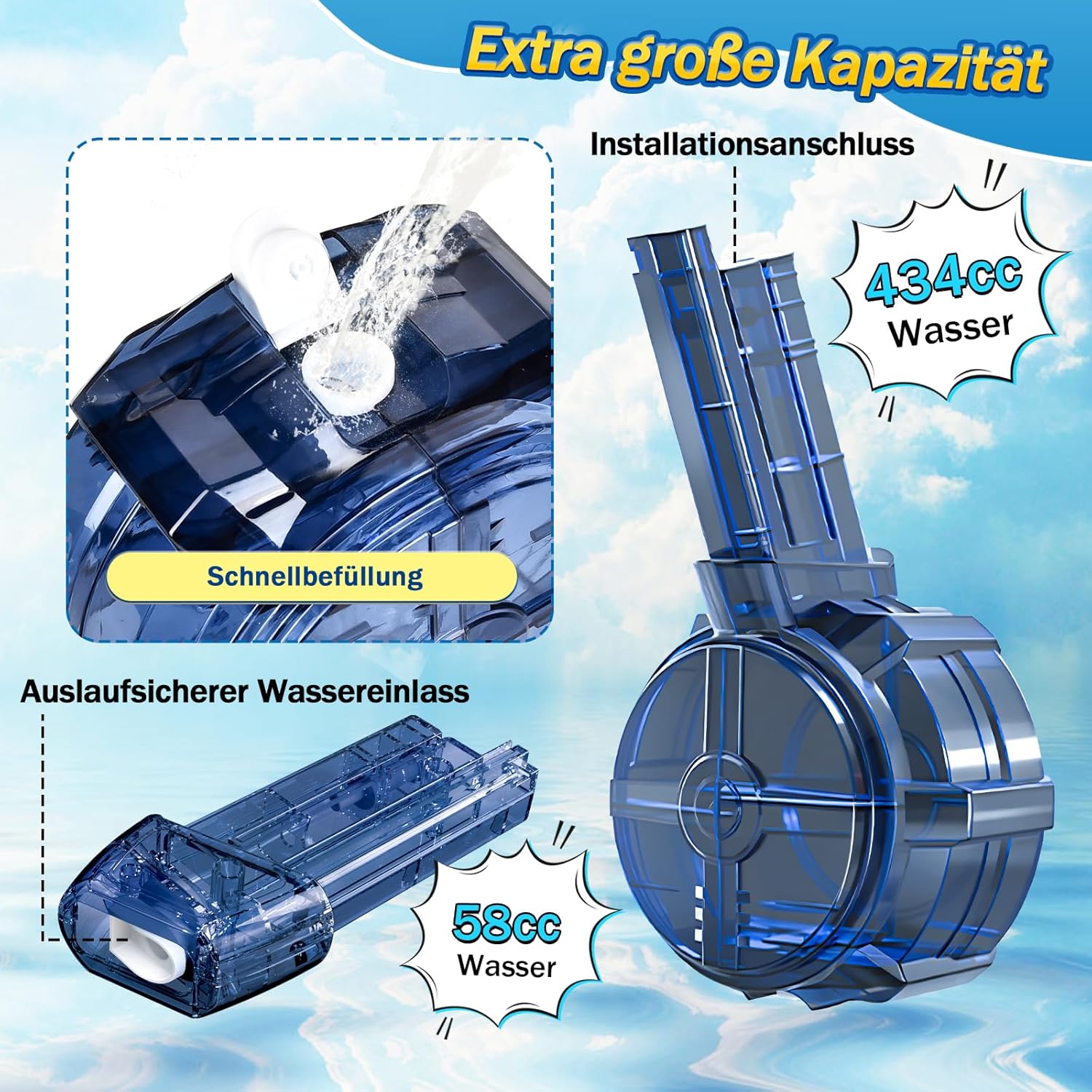 🎯 Long Range & Dual Capacity Features 434 ml + 58 ml dual tanks, allowing up to 420+ shots per refill and an impressive 22–35 ft shooting distance.